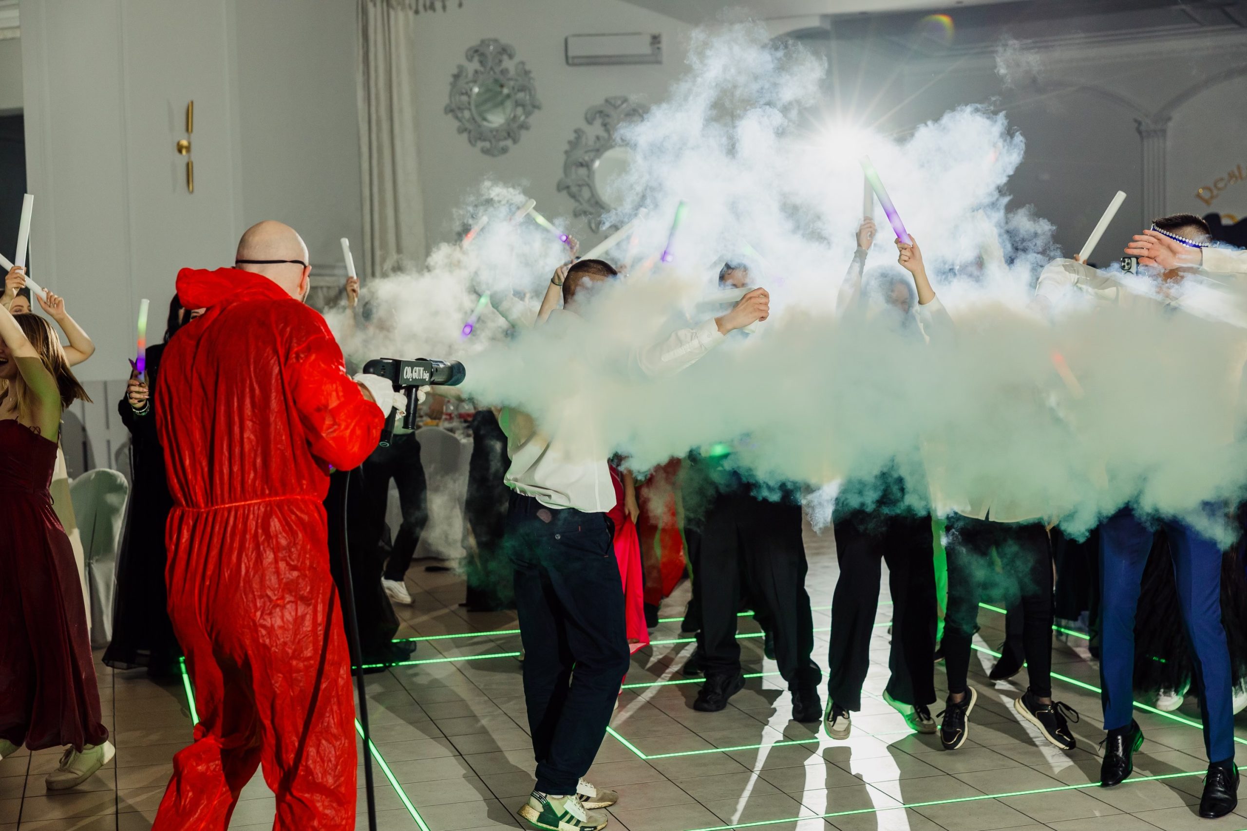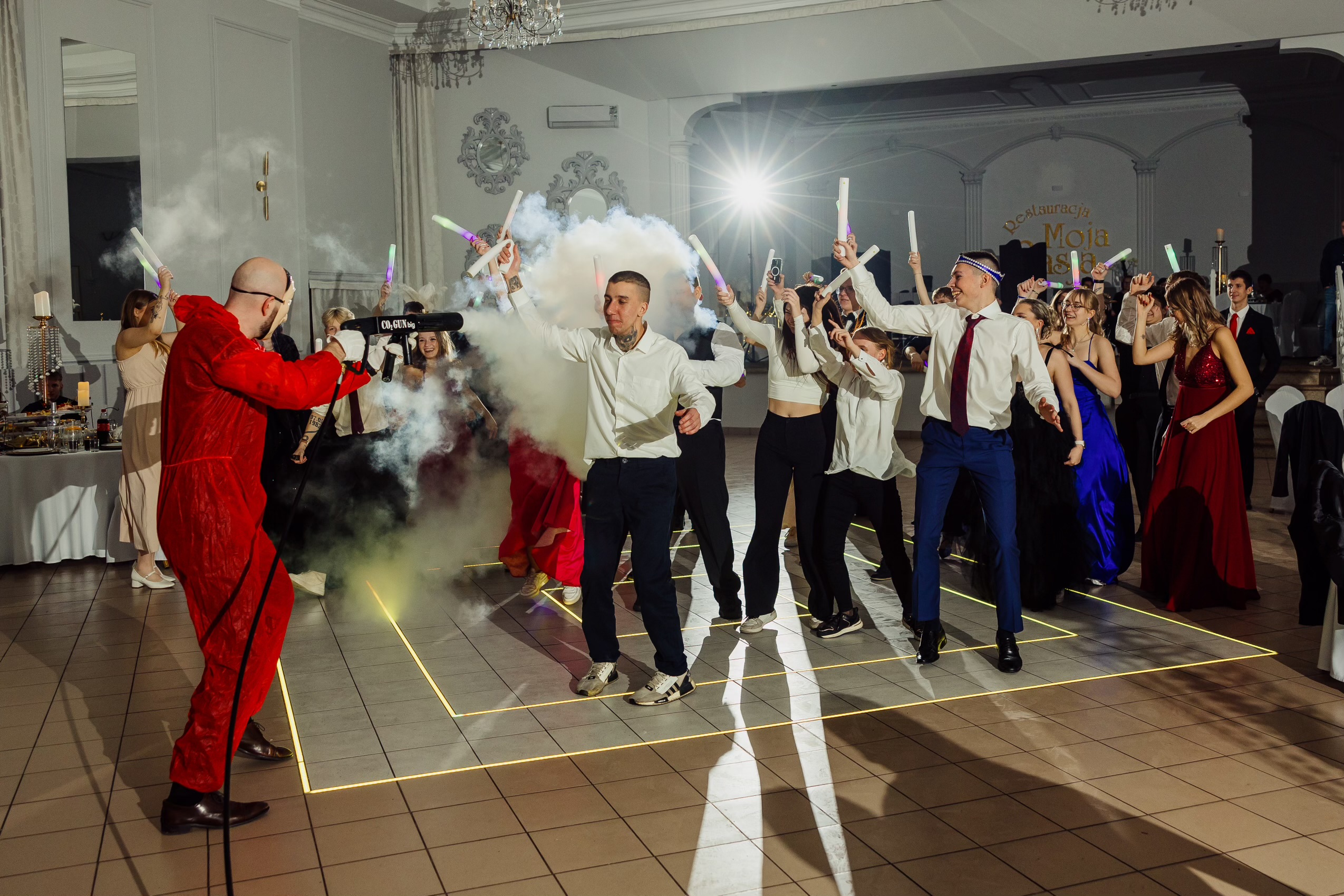Ciężki dym (taniec w chmurach) • Iskrownice sceniczne • Power Hour (show z pałkami LED i CO₂ gun) • Fotobudka AI • Napis LOVE